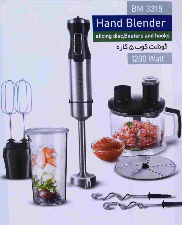 ۵ کاره شامل :گوشتکوب، خردکن، رنده (سالاد ساز)، همزن، خامه زن