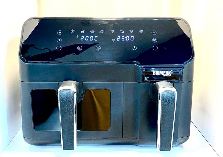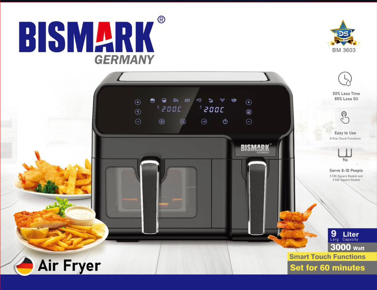 BM3603 جدیدترین سرخ کن دوقلوی برند بیسمارک است که از دو کاسه با ظرفیتهای متفاوت بهره میبرد و در دسه سرخ کن های بدون روغن قرار میگیرد. کاسههای ۳.۵ و ۵.۵ لیتری این دستگه در محفظهای کشویی قرار میگیرند و پوششی نچسب و ضد خش از آنها مراقبت میکند. سرخ کن دوقلو بیسمارک ۳۶۰۰ با توان ۳۰۰۰ وات عمل میکند و از این منظر در دسته قدرتمندترین محصولات موجود در بازار قرار میگیرد. پنل لمسی دیگر ویژگی برجسته دستگاه BM3600 به شمار میآید که در آن از ۶ دستور پخت کاربردی بهره گرفته شده است. «قابلیت پخت جداگانه در هر محفظه به صورت همزمان» قابلیت ویژه این سرخ کن خوشساخت محسوب میشود و نیز هر کاسه دارای یک نمایشگر گزاش وضعیت پخت جداگانه است.