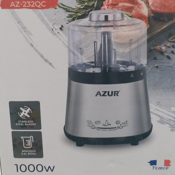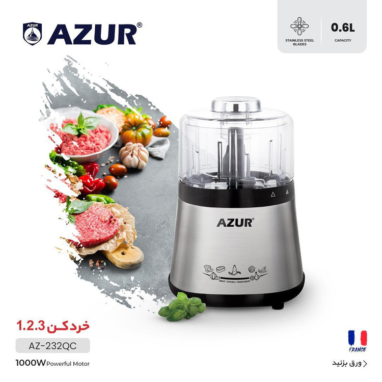 خردکن 1.2.3 آزور AZUR مدل AZ-232QC از برند فرانسوی با توان 1000 واتی با بهره گیری از موتور مسی و تیغه های فولادی ضد زنگ قادر به خرد کردن گوشت، میوه، سالاد و انواع سبزیجات می باشد. با استفاده از خردکن 1.2.3 آزور به راحتی می توانید انواع مواد غذایی را در کمترین زمان ممکن به طور یکدست خرد کنید.