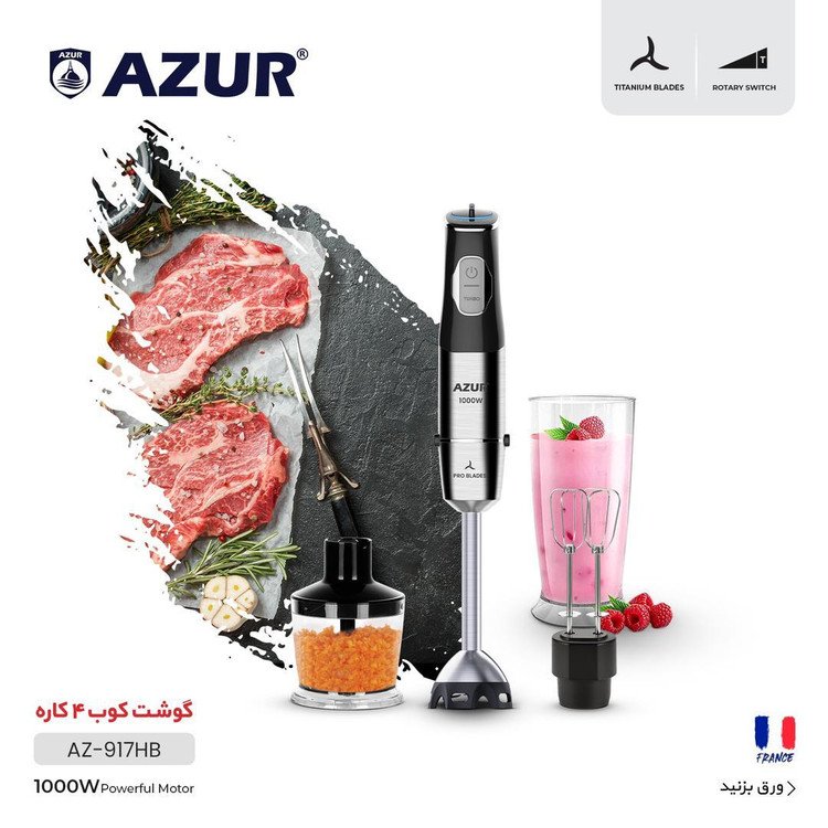 گوشتکوب چندکاره آزور azur مدل AZ-917HB از برند فرانسوی با توان 1000 واتی می تواند تمام موادی که نیاز به کوبیدن دارند را برای شما به راحتی و در عرض چند دقیقه انجام دهد.