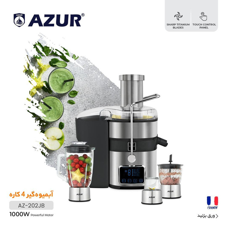 آبمیوه-گیر-چهار-کاره-آزور-azur-مدل-AZ-202JB از محصولات برند آزور ساخت کشور فرانسه می باشد. این آبمیوه گیر با داشتن توان و قدرت 1000 واتی می تواند در سریع ترین زمان ممکن یک نوشیدنی دلپذیر به شما تحویل دهد.