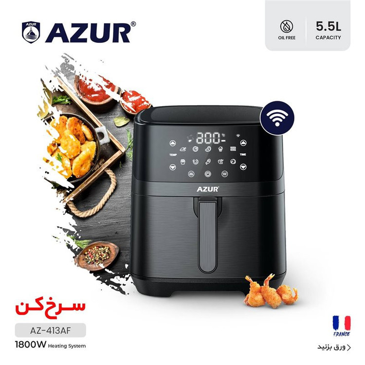 سرخکن بدون روغن آزور مدل AZ-413AF با توان 1800 وات و ظرفیت 5.5 لیتر مجهز به صفحه نمایشگر لمسی می باشد این مدل سرخکن بدون روغن آزور دارای قابلیت اتصال به گوشی هوشمند به کمک وای فای است