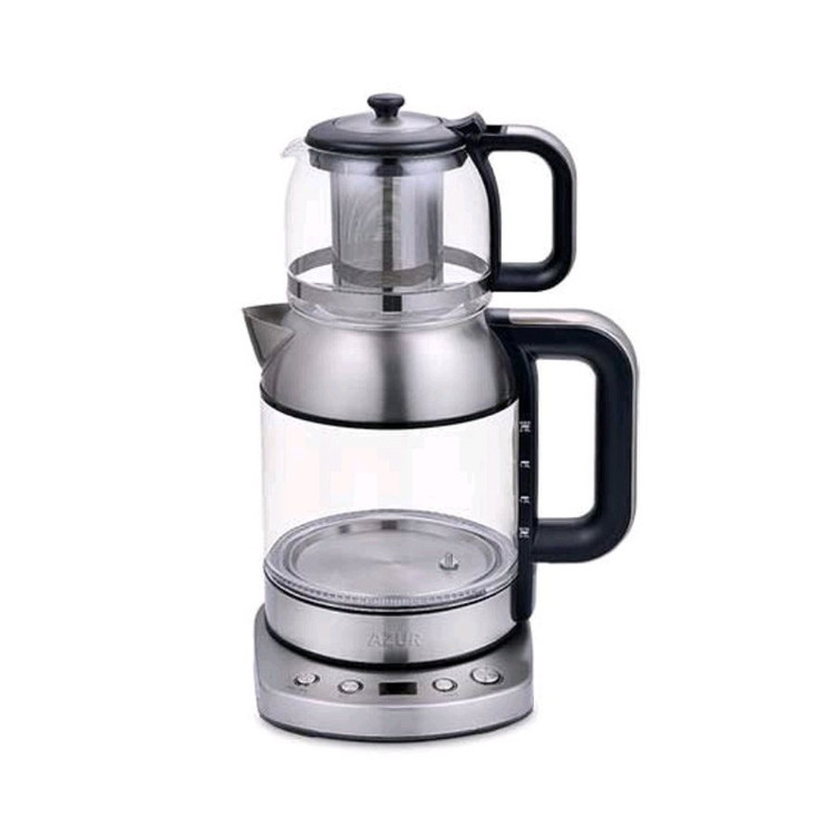 چای ساز آزور مدل AZ-634TM با توان 2200 وات مجهز به المنت مسی یا استریکس و شاخص آب داخل کتری می باشد این چای ساز از قوری چای از جنس شیشه شفاف برخوردار است و قابلیت چرخش 360 درجه را دارد از این مدل چای ساز آزور برای انواع دم نوش هم می توان استفاده کرد و همچنین مجهز به دکمه گرم نگهدارنده است