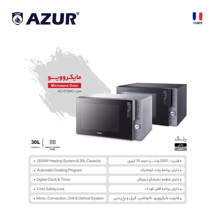 مایکروویو آزور تحت لیسانس فرانسه مدل AZ-472MO با ظرفیت 30 لیتر و توان 2000 واتAZUR