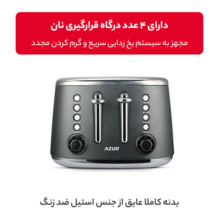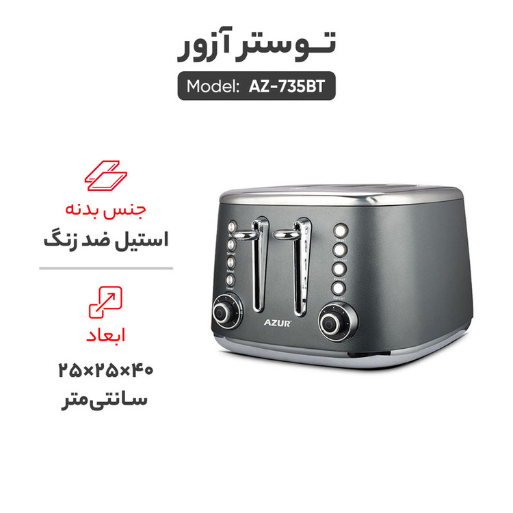 توستر نان آزور مدل AZ-735BT با توان 2000 وات و بدنه کاملا عایق از جنس استیل ضد زنگ و دارای 4 عدد درگاه قرارگیری نان است این دستگاه مجهز به سیستم یخ زدایی سریع و گرم کردن مجدد هم میباشد