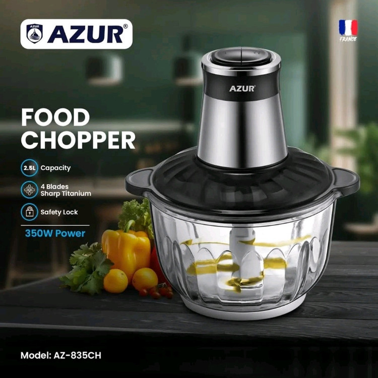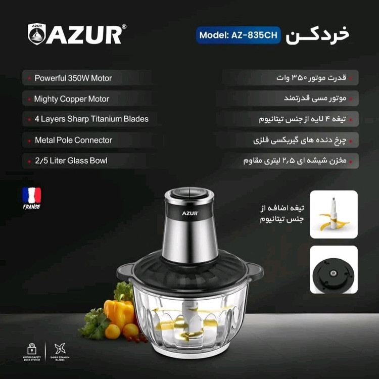 خردکن آزور مدل AZ-835CH دارای موتور قدرتمند مسی با توان 350 وات مجهز به چهار تیغه از جنس تیتانیوم که از گیربکس کاملا فلزی برخوردار است ظرف این خردکن از جنس شیشه مقاوم به ظرفیت 2.5 لیتر می باشد