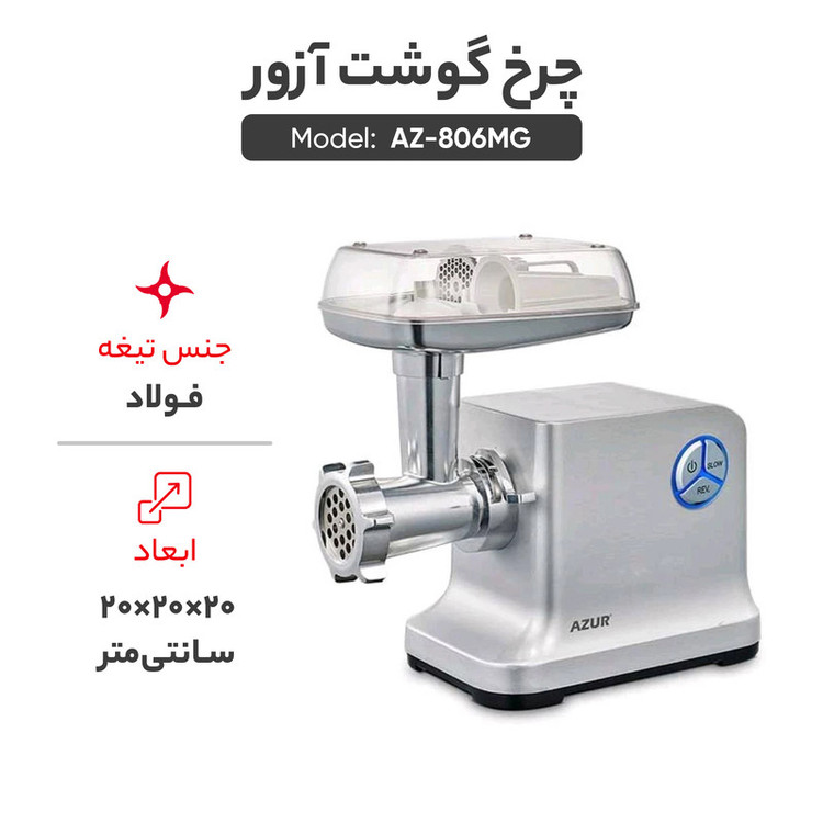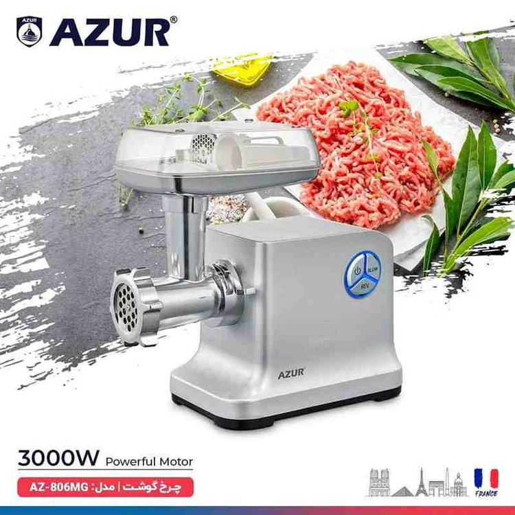 چرخ گوشت آزور مدل AZ-806MG با بدنه کاملا فلزی و قدرت 3000 وات دارای دو تیغه فولادی بسیار تیز و ضد زنگ و گیربکس کاملا فولادی همراه با محفظه نگهدارنده گوشت می باشد این مدل چرخ گوشت از صفحات خروجی به همراه سوسیس ساز برخوردار است