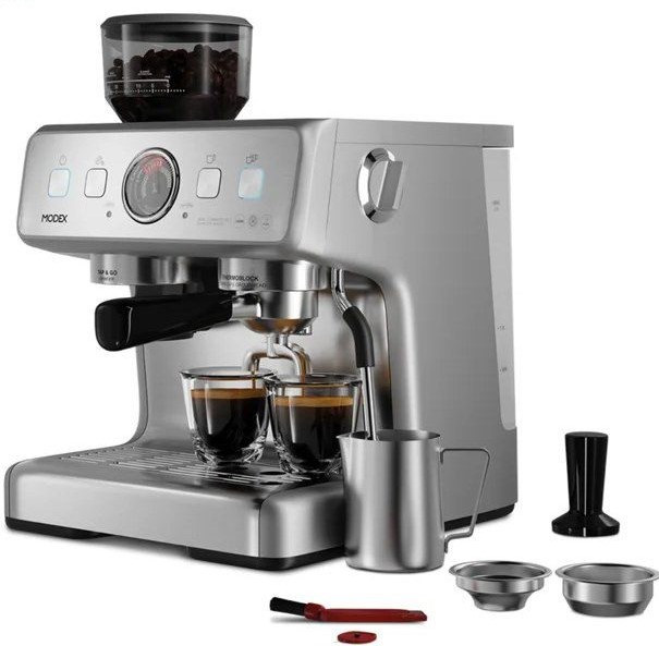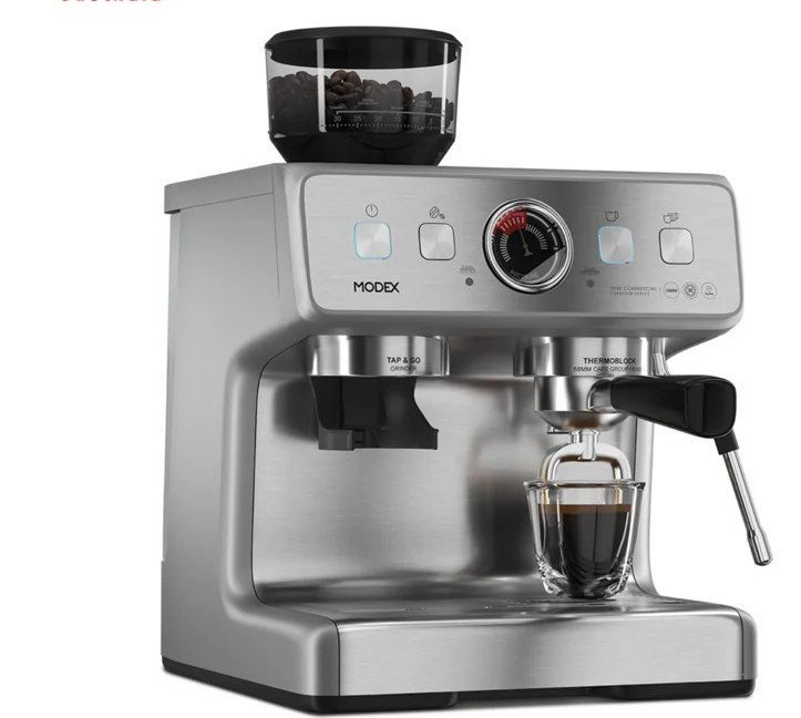 این دستگاه با توان بالای ۱۵۵۰ وات و پمپ فشار ۲۰ بار می تواند مناسب ترین قهوه با خامه عالی را در اختیار شما قرار دهد. مودکس دارای کف شیر حرفه ای برای تهیه کف شیر و درست کردن انواع نوشیدنی های قهوه نظیر کاپوچینو لاته و …می باشد. مخزن آب با قابلیت جدا شدن ظرفیتی معادل ۲٫۸ لیتر دارد این قهوه ساز با یک گروپ اضافی عرضه میشود.