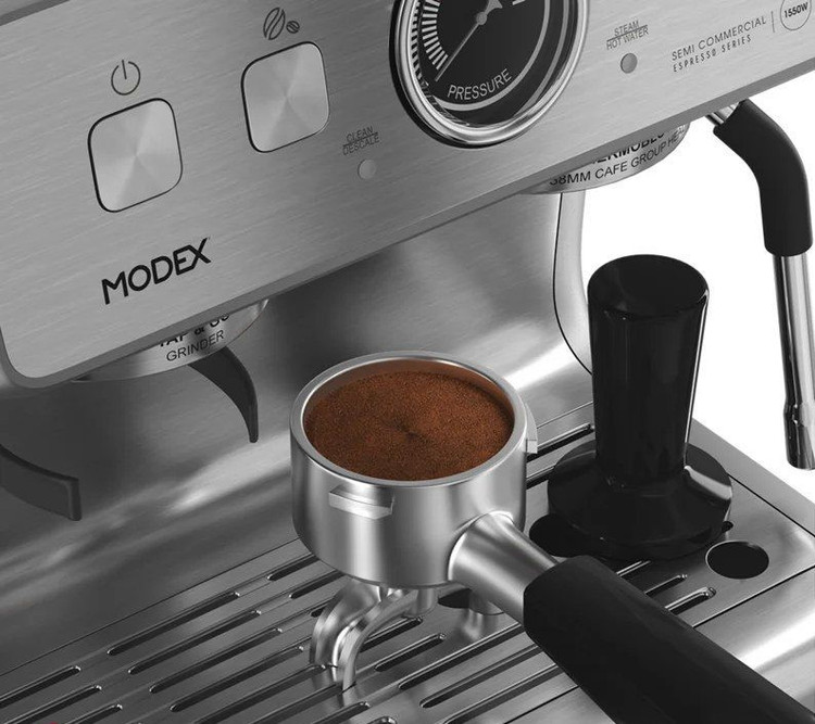 ویژگی منحصر به فرد اسپرسو ساز نیمه صنعتی مودکس داشتن یک آسیاب سر خود با تیغه های استیل ضد زنگ است. ساختار آن مخروطی (سنگ آسیابی) با دهانه ۵۴ میلیمتر است قابلیتی که می تواند تا ۳۰ درجه قهوه را آسیاب نماید. و در سه مرحله، ریز، متوسط و درشت در اختیار شما قرار دهد. حجم کلی آسیاب معادل ۲۵۰ گرم است. با داشتن این قابلیت شما دیگر نیازی به خرید آسیاب کن در کنار دستگاه ندارید. موردی که همچنین از لحاظ اقتصادی و فضای اشغال شـده در خانه یا کافه شما بهترین انتخاب ممکن خواهد بود. در منوی جلوی دستگاه یک عقربه وجود دارد که نشان دهنده ای فشار بخار پمپ داخل دستگاه در موقع کار می باشد.