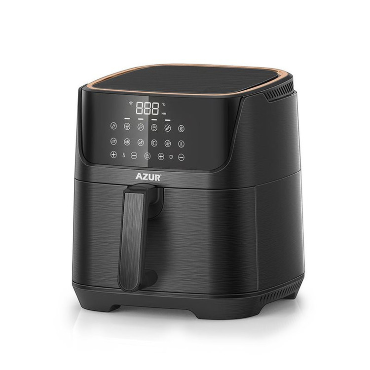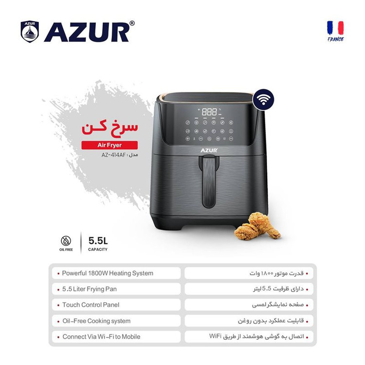 سرخ کن بدون روغن آزور مدل AZ-414AF با توان 1800 وات و ظرفیت 5.5 لیتر که دارای صفحه نمایشگر لمسی می باشد این مدل سرخکن بدون روغن آزور قابلیت اتصال به گوشی هوشمند به کمک وای فای است و همچنین از سبد جداشونده و قابل شستشو برخوردار است