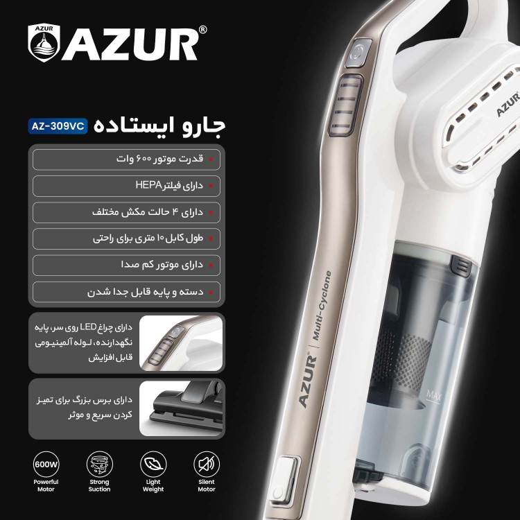 از مهم ترین ویژگی های جارو برقی ایستاده آزور مدل AZ-309VC نداشتن سر و صدای زیاد است. اگر نیاز دارید که جاروبرقی کم صدا و بدون صدا تهیه کنید قطعا پیشنهاد ما همین جاروبرقی از برند آزور است.