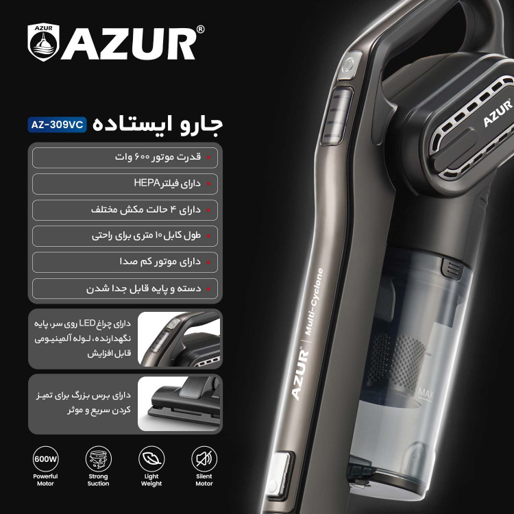 جارو برقی ایستاده آزور مدل AZ-309VC با توان 600 وات دارای سیستم وکیوم دو در یک است. این جاروبرقی همچنین 4 عملکرد جداگانه با قدرت مکش متفاوت دارد که براساس نیاز شما می توانید یکی از مودها را انتخاب کنید.
