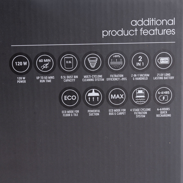 دارای 4 لامپ ال ای دی برای روشنایی/دارای سیستم مولتی سیکلون برای تمیزکاری/دارای حالت اکو برای زمین، کاشی ، فرش و مبل/دارای سیستم فیلتراسیون 4 مرحله ای/میزان بازدهی فیلتراسیون بیشتر از 99 درصد/دارای چراغ نشانگر ال ای دی برای نمایش میزان شارژ